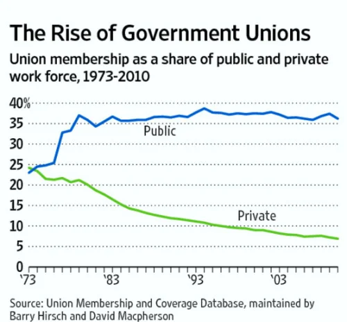 After its momentous decisions this year legalizing gay marriage throughout the US, saving Obamacare one more time, and preserving the option of nonpartisan redistricting, the Supreme Court of the United States said it will decide next year on whether public sector unions can legally force those who work for the government to pay union dues even if they disagree with what the union is doing. If the Supreme Court addresses this question squarely, this will be a momentous decision because public sector unions are where the action is in unionization. In the last three decades, unionization fell dramatically in the private sector, but rose dramatically in the public sector (see above). The most likely reason is that public sector unions can offer political foot-soldiers to garner votes for those of their bosses who behave themselves as well as labor peace, while private sector unions can only provide labor peace. Without the combination of a political weapon and a strike weapon, I don’t see how public sector unions could have been so much more successful than private unions. Thus, I think the challengers’ contention the public sector unions are inherently political is quite reasonable.