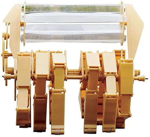 The Mini Rhinoceros owes its design to Theo Jansen, an artist who makes giant versions of such wind-powered mechanical animals. You can see an interview with Theo Jansen here. (That link also leads to many other related videos.)