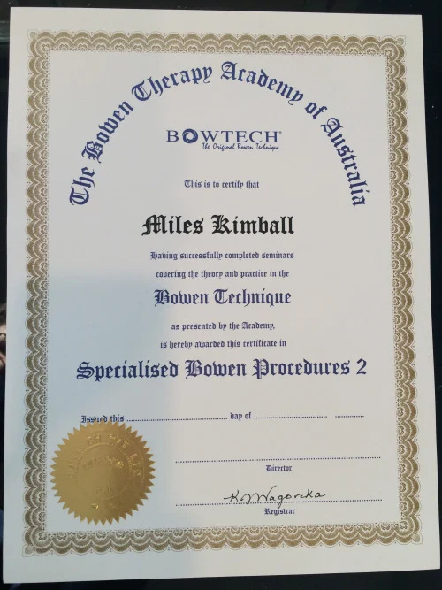 Miles’s Certificate for the highest level of training for the Bowen Technique