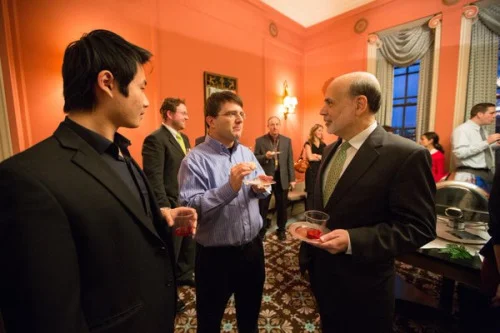 Photo of Miles telling Yang Liu and Ben Bernanke how good the hors d’oeuvres are and how to eliminate the zero lower bound when Ben Bernanke came to give a talk at the University of Michigan on January 14, 2013