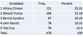Thus, leaving aside any effects from strategic voting (and ignoring for the moment the timing of our survey and the non-representativeness of our sample), our data point to John Kasich as most likely to have won the election using NGA to resolve the multicandidate choice over all of these five candidates. While his mediocre performance under our current voting system suggests that he was not the favorite candidate of all that many voters, our respondents overall found him relatively acceptable.