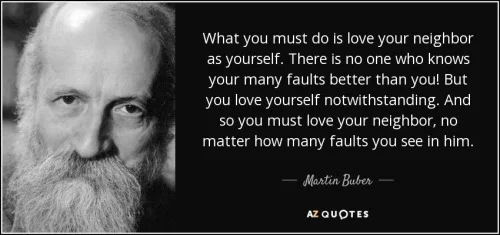 There are many dimensions of the principle of equality among humans. The most difficult is expressed by the Biblical command “Love your neighbor as yourself” (Leviticus, 19:18; Matthew 22:39). The Martin Buber quotation above points to some of the bias toward self that would have to be overcome to actually obey this command.