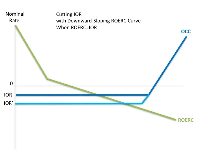 If the ROERC curve is downward sloping, for whatever reason—and the monetary base is large enough to make the opportunity cost of cash equal to IOR—reductions in IOR lower the interest rate even if the exchange rate at the central bank's cash window between paper currency and reserves is left at par: