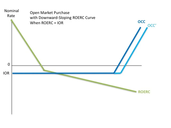 With a ROERC curve flat at zero beyond a certain point, the interest rate won't drop below zero even if the monetary base is large and IOR is negative. Moreover, starting from that situation, increasing the monetary base will do nothing to the interest rate, which will stay at zero.