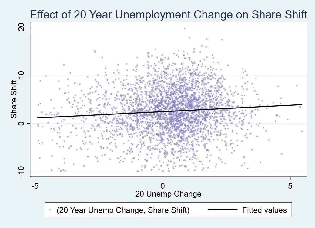 When running all four variables at once, they are all positively correlated with share shift, and are all significant with 97% confidence or higher. When each variable is regressed alone with the controls, they are all significant and positively correlated. The cross terms for 2016 unemployment and population loss were both positive and significant in their respective regressions. Furthermore poor economic outcomes are significant when dividing the population into certain subsets, like counties Obama won and the 500 top densely populated counties, and even remained when weighting each county by 2014 population[1].
