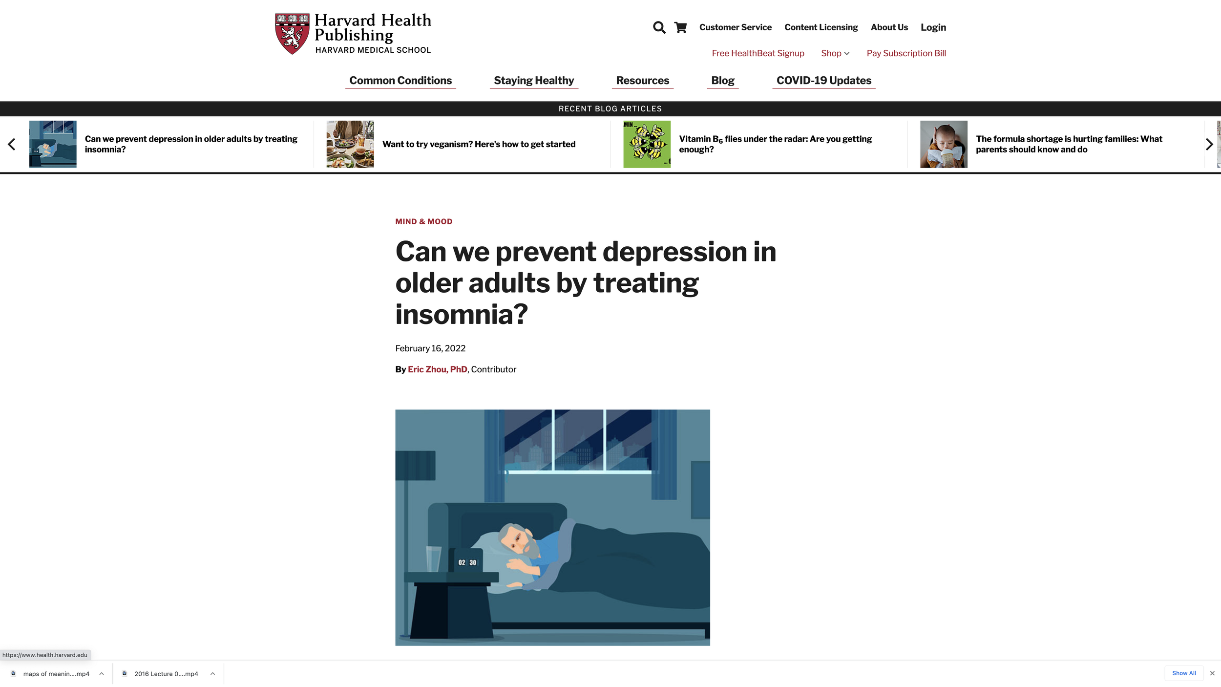 The result in “Prevention of Incident and Recurrent Major Depression in Older Adults With Insomnia” by Michael R. Irwin, Carmen Carrillo, Nina Sadeghi, Martin F. Bjurstrom, Elizabeth C. Breen, and Richard Olmstead that “Cognitive Behavioral Therapy for Insomnia” (CBT-I) applied to adults 60 years or older who have insomnia, but don’t initially qualify as having major depression both reduces insomnia and reduces the incidence of major depression. This is a very useful thing to know.