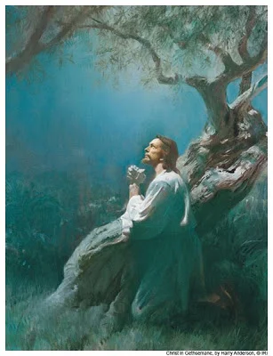 Relative to Orthodox, Catholic and Protestant beliefs, the unusual aspect of this passage is that Jesus’ saving act, or in an old word, the atonement of Jesus Christ, takes place in the Garden of Gethsemane rather than on the cross. This is a big part of the explanation for the almost complete absence of the cross in Mormon iconography. It is very hard to find any crosses or crucifixes anywhere in a Mormon church building, except inside a Sunday School manual or perhaps on an outside visitor’s necklace. Instead, in order to symbolize Jesus’ saving act, Mormon church buildings often have a picture like this of Jesus in the Garden of Gethsemane: